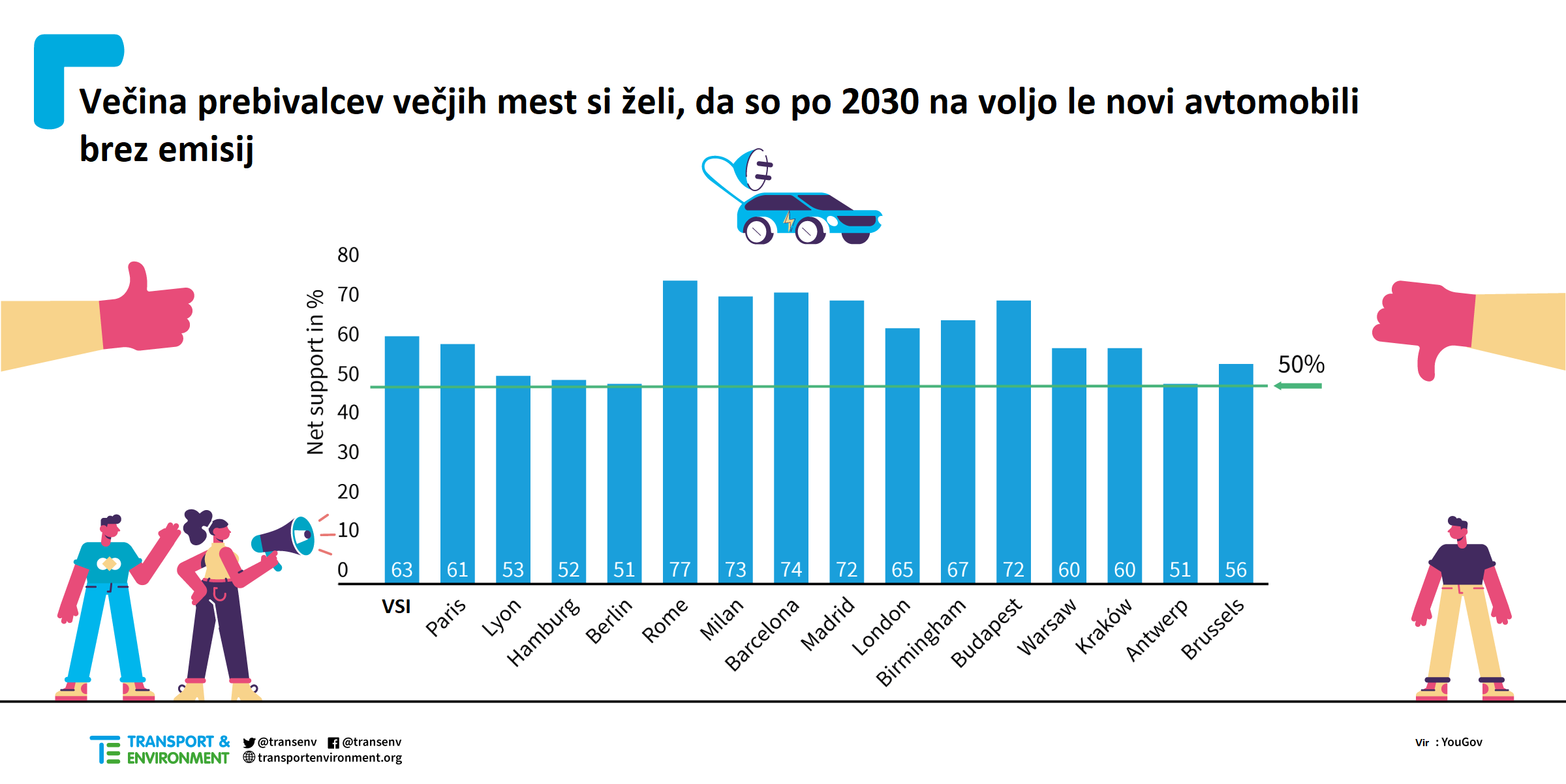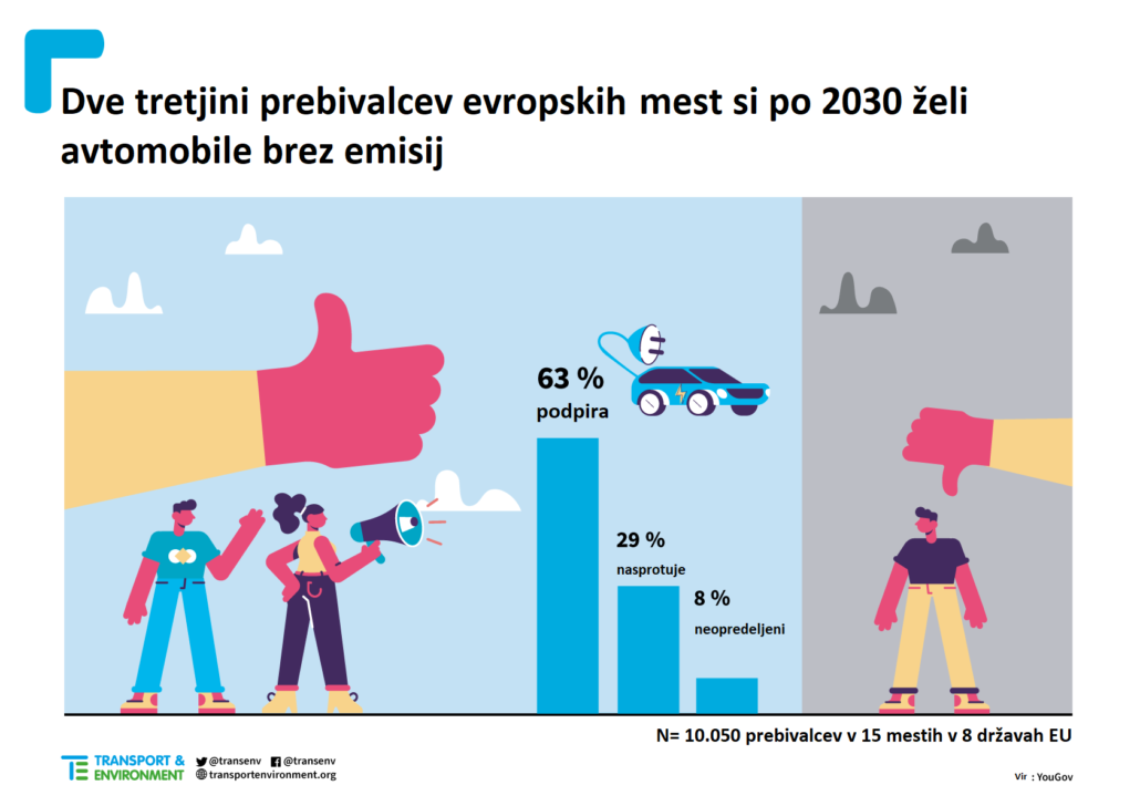 Skoraj dve tretjini prebivalcev večjih evropskih mest podpira prepoved prodaje vozil na bencinski in dizelski pogon v Evropi po letu 2030. To je v 15 evropskih mestih ugotovila raziskava javnega mnenja agencije YouGov, ki jo je naročila organizacija Transport and Environment. Vseevropska opustitev prodaje avtomobilov na fosilna goriva je ena od možnosti za EU zakonodajalce, ko pripravljajo zakonodajo za doseganje podnebne nevtralnosti Evrope do 2050.