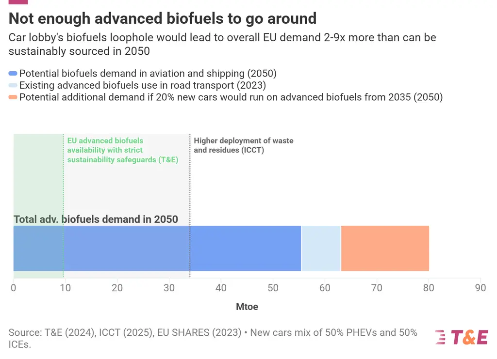 Dodatno povpraševanje bi pomenilo, da bi avtomobili, letala in ladje skupaj porabili bistveno več naprednih biogoriv, kot jih je mogoče trajnostno proizvesti. Že ob obstoječih ciljih EU naj bi letalstvo in ladijski promet do leta 2050 potrebovala približno dvakrat več trajnostnih biogoriv, kot jih bo Evropa sposobna zagotoviti – tudi v najbolj optimističnem scenariju.