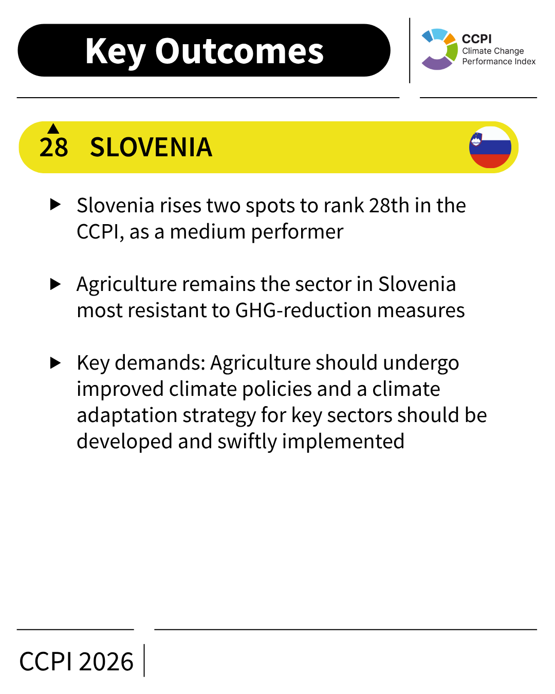 Na danes objavljeni lestvici Climate Change Performance Index (CCPI) 2026 je Slovenija na 28. mestu. To pomeni, da je na lestvici uspešnosti boja s podnebnimi spremembami napredovala za dve mesti in se je po lanskem napredovanju za 11 mest obdržala v družbi držav, ki so na tem področju »srednje uspešne«. Napredek izhaja iz novih nacionalnih podnebno-energetskih ciljev in sprejetja podnebnega zakona, ki premika cilj podnebne nevtralnosti na leto 2045. Kljub temu pa analiza kaže, da prehod poteka prepočasi, zlasti pri obnovljivih virih energije, rabi energije in ukinitvi subvencij za fosilna goriva.