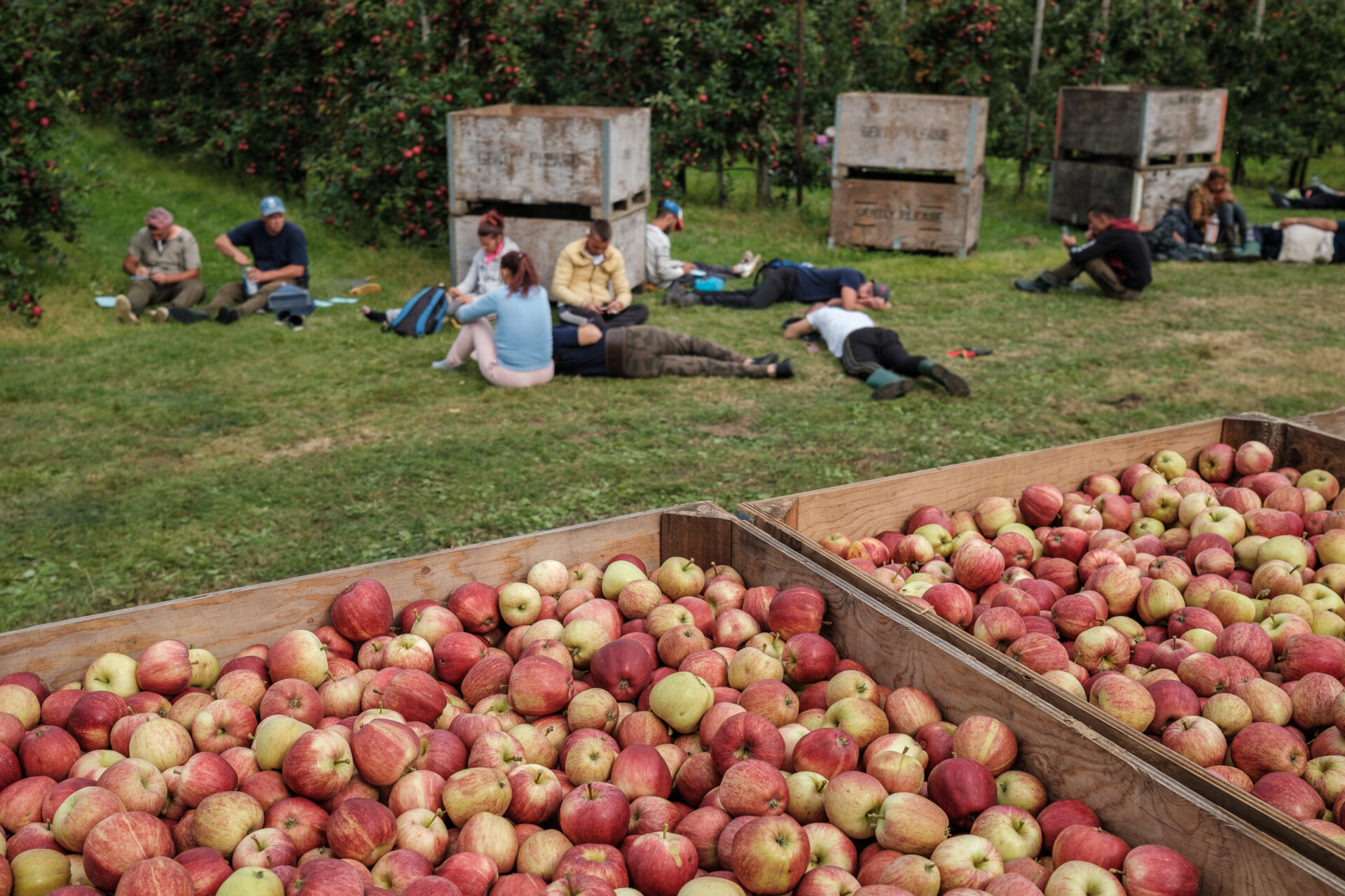 Romunski delavci migranti med odmorom za kosilo na kmetiji Old Parsonage v Cobhamu, Kent, Združeno kraljestvo. 26. september 2021. Foto: Cosmin Bumbuț / Telele.eu