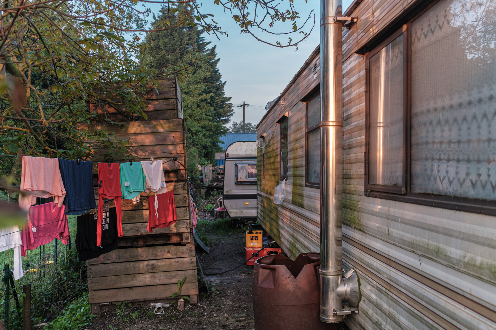 Prikolice, v katerih bivajo romunski delavci na kmetiji v Verlainu v Belgiji. 10. maj 2024. Foto: Cosmin Bumbuț / Telele.eu