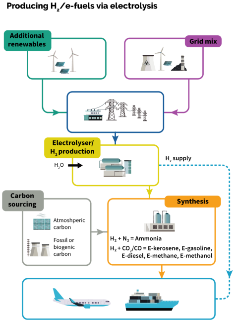 Neposredno polnjenje električnih vozil z (obnovljivo) električno energijo je veliko bolj učinkovito kot pretvorba električne energije v vodik in e-goriva. Zato se je pri RFNBO treba osredotočiti na tiste gospodarske sektorje, kjer elektrifikacija ni primerna. To sta predvsem pomorski in letalski promet, kjer je zahtevana višja gostota energije.