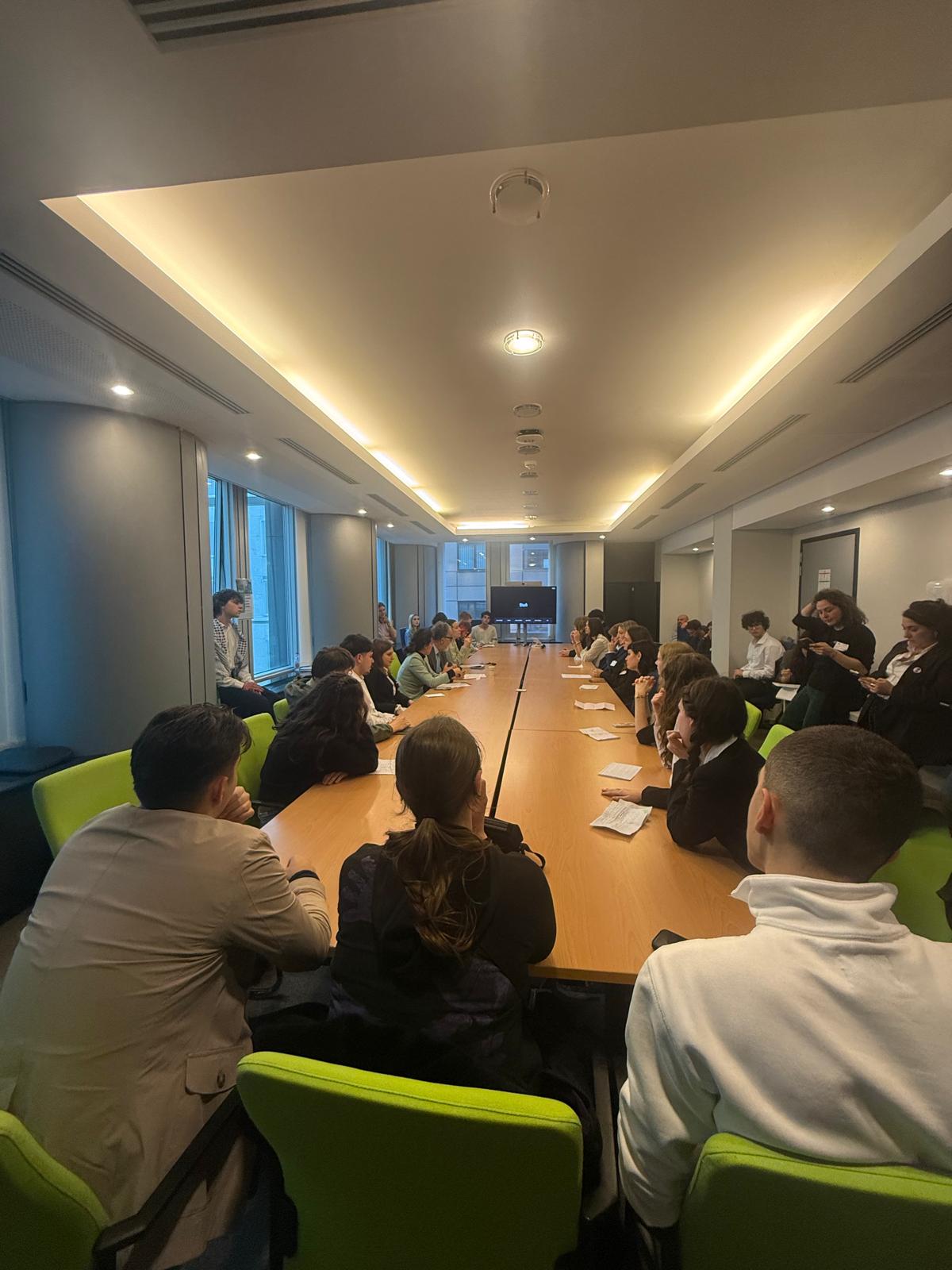 Po uradnem srečanju je imela slovenska skupina prijeten neformalni pogovor s poslanko Ireno Jovevo, ki je v svojem prepoznavnem in transparentnem slogu iskreno odgovarjala na naša vprašanja o temah, ki zadevajo tako celotno Evropsko unijo kot tudi Slovenijo. Joveva je izpostavila priložnosti in izzive, s katerimi se srečuje pri svojem delu, ter nam ponudila vpogled v to, kako je biti evropski poslanec v tako hitro spreminjajočem se času, kot je današnji. Dan se je zaključil še s hitrim ogledom parlamenta in razgleda iz 14. nadstropja.