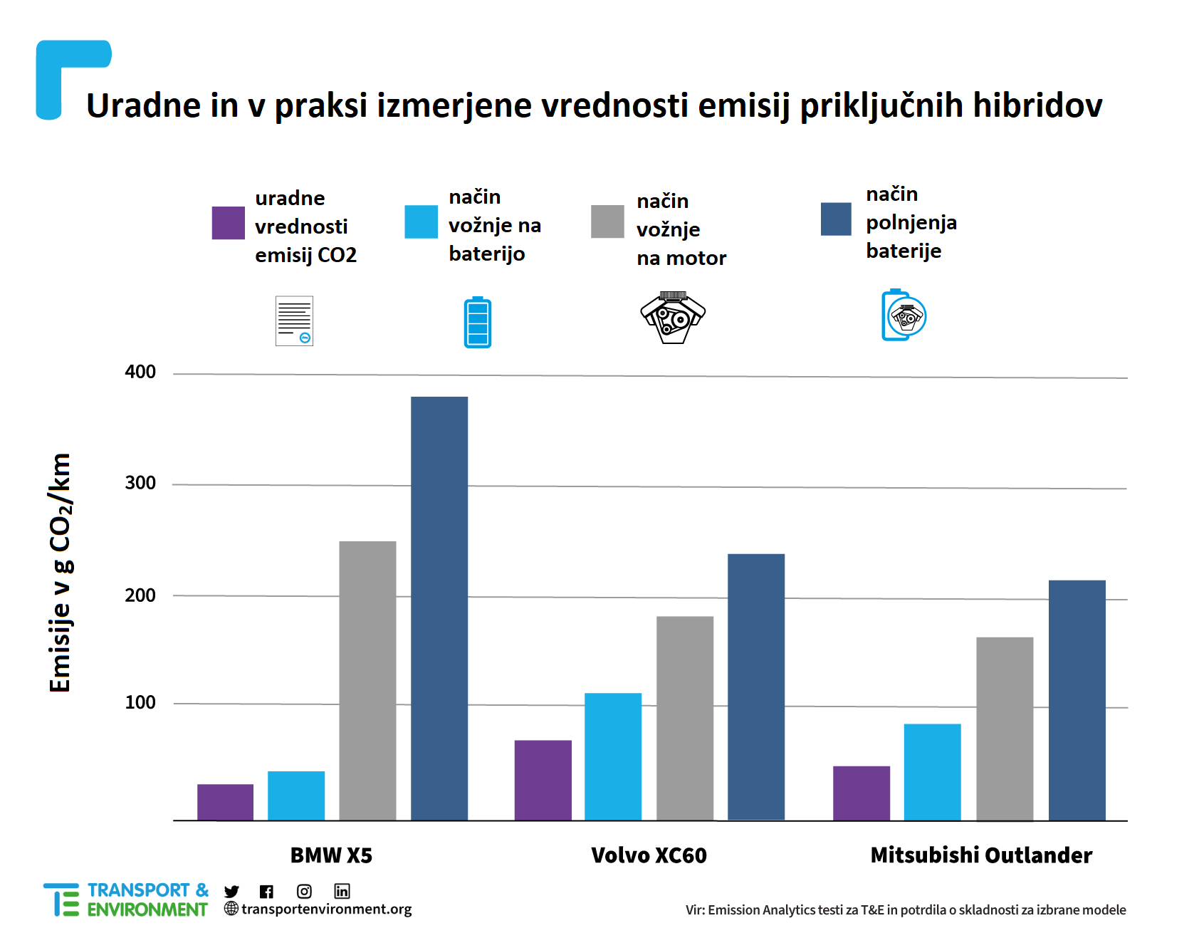 Prodaja priključnih hibridnih vozil (PHEV) v Evropi zelo hitro narašča, toda preizkusi najnovejših modelov so potrdili, da ti onesnažujejo okolje precej bolj, kot to trdijo njihovi proizvajalci – tudi v primeru, da začnejo vožnjo z napolnjeno baterijo. Vsi trije najpriljubljenejši modeli priključnih hibridov v letu 2020 so imeli na preizkusu v realnih pogojih višje emisije CO2 od oglaševanih, enako kot so pokazale raziskave za starejša vozila PHEV [1].