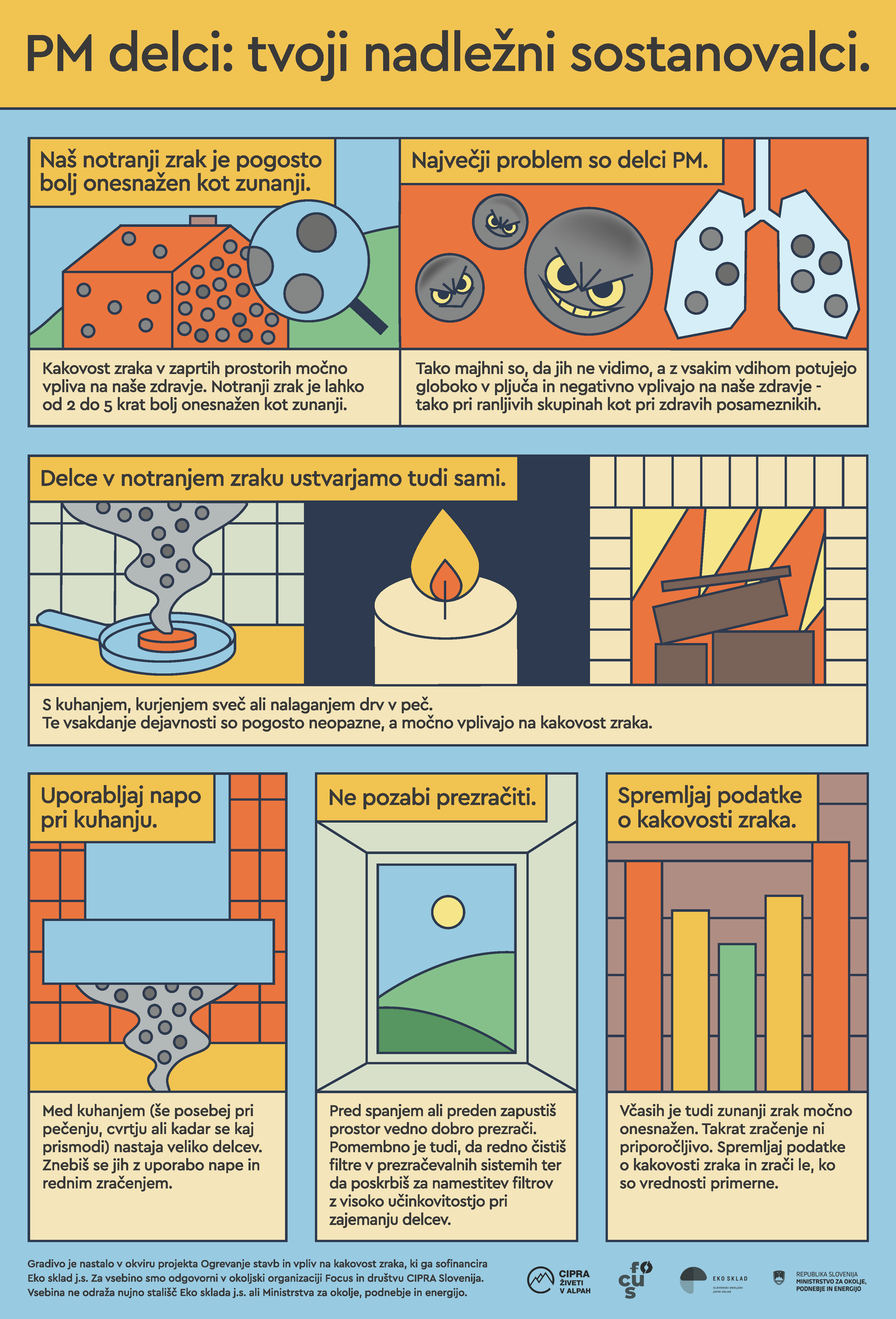 Tudi kakovost zraka v zaprtih prostorih močno vpliva na naše zdravje. Notranji zrak je lahko do petkrat bolj onesnažen kot zunanji. Zakaj je tako, zakaj so PM delci naši nadležni sostanovalci in kako ravnati preventivno, da sami doma ustvarimo čim manj PM delcev, smo v sodelovanju z društvom CIPRA Slovenija predstavili v infografiki, ki so jo pripravili v Studiu Ljudje.