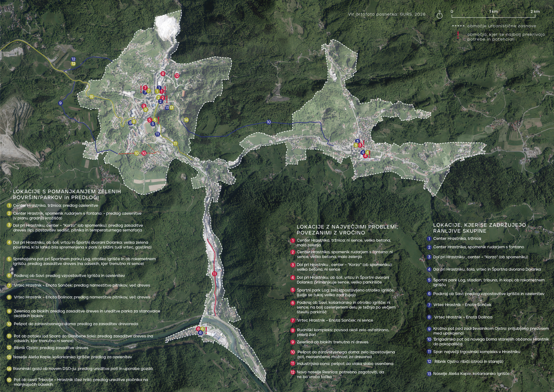 V drugem delu delavnice so udeleženci na ortofoto posnetku urbanistične zasnove Hrastnika označevali lokacije, kjer je poleti najbolj vroče, območja, kjer primanjkuje zelenih površin in parkov oziroma kjer so potrebne izboljšave, ter lokacije, kjer se najpogosteje zadržujejo ranljive skupine prebivalcev. Rezultat je prikazan spodaj – s klikom lahko vidite bolj podroben zemljevid.