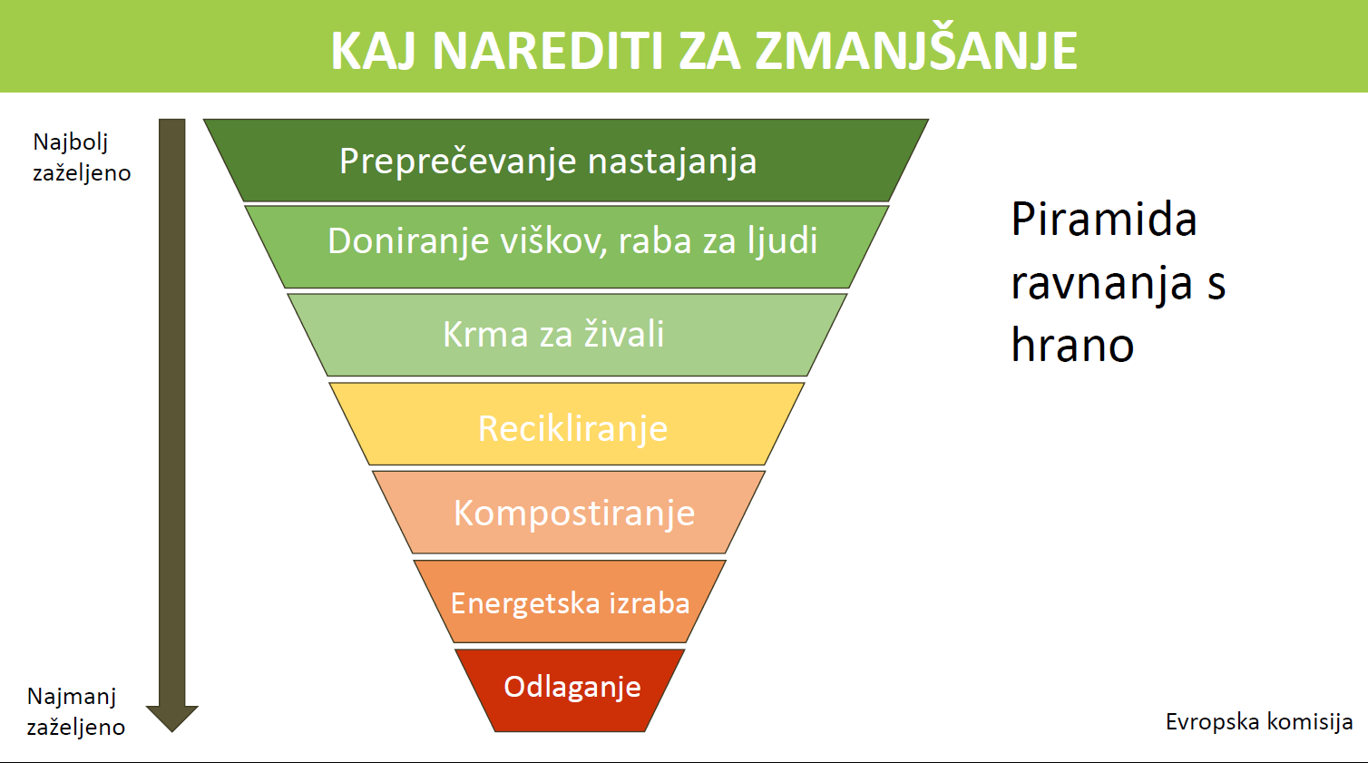 Za zmanjšanje količine odpadne hrane je ključno tako načrtovanje kot tudi merjenje. Javnim uslužbencem je Zgojznik predlagala, da vodijo dnevnik zavržene hrane, da analizirajo kaj in zakaj gre v smeti ter nato na podlagi tega iščejo rešitve. Kot glavno vodilo za vse posameznike tako doma kot v organizaciji pa je Zgojznik izpostavila piramido ravnanja s hrano, ki izhaja iz hierarhije ravnanja z odpadki. Na prvem mestu naj bo preprečavaje nastajanja odpadne hrane, na drugem doniranje viškov, sledi krma za živali, nato pa šele recikliranje, kompostiranje, energetska izraba in na zadnjem mestu odlaganje.