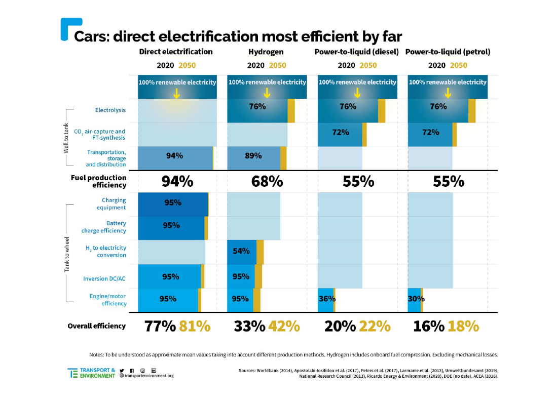“Za razogljičenje prometa bomo potrebovali velike količine elektrike iz obnovljivih virov energije, zato jo moramo uporabiti na najbolj učinkovit način. Direktna elektrifikacija je dvakrat bolj učinkovita kot vozilo na vodik in štirikrat bolj učinkovita od uporabe sintetičnih e-goriv v vozilih z motornim z notranjim zgorevanjem. Zato dajemo prednost direktni elektrifikaciji.”